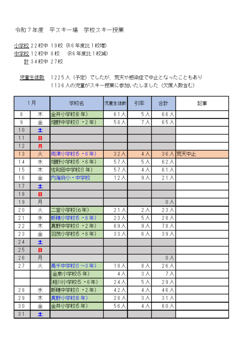 今年の小中学校スキー授業は1月8日から2月27日の毎週(火・水・木・金)に実施されました。