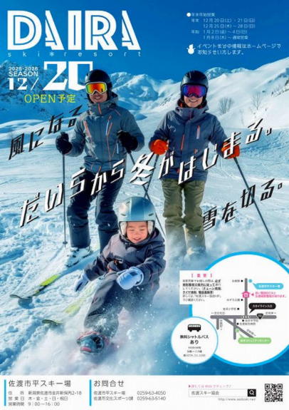 *平スキー場はオープンを12月20日(土)に予定しておりましたが、降雪積雪がないため、延期をさせていただきます。